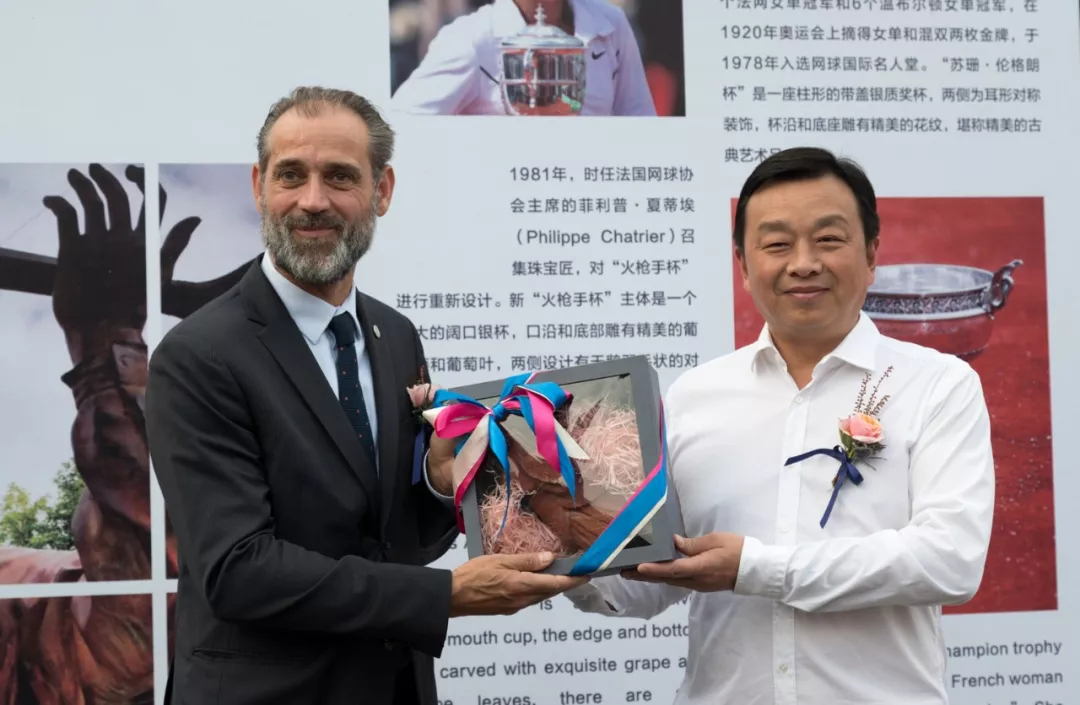 在法國周·臨空新城啟動(dòng)儀式上,黃陂區委書(shū)記吳祖云向法國網(wǎng)球羅蘭加洛斯網(wǎng)球俱樂(lè )部副主席巴頓先生贈送了黃陂特色禮物——泥塑花木蘭。